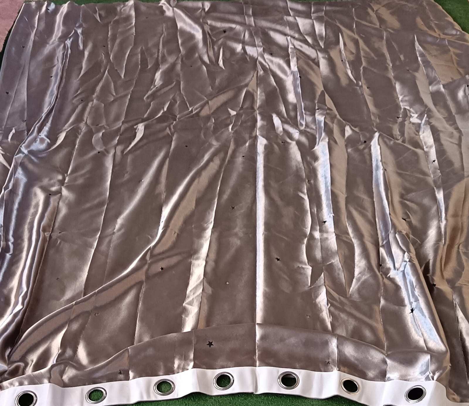Tendaggio a sfondo grigio con ritagli di stelle con 14 anelli, unico pezzo e velo di tulle dalle parte posteriore. Può essere usato in stanzetta decorando una finestra di grande dimensione oppure essere utilizzato come sfondo per occasioni natalizie e altro. Inclusa nappa per legare.